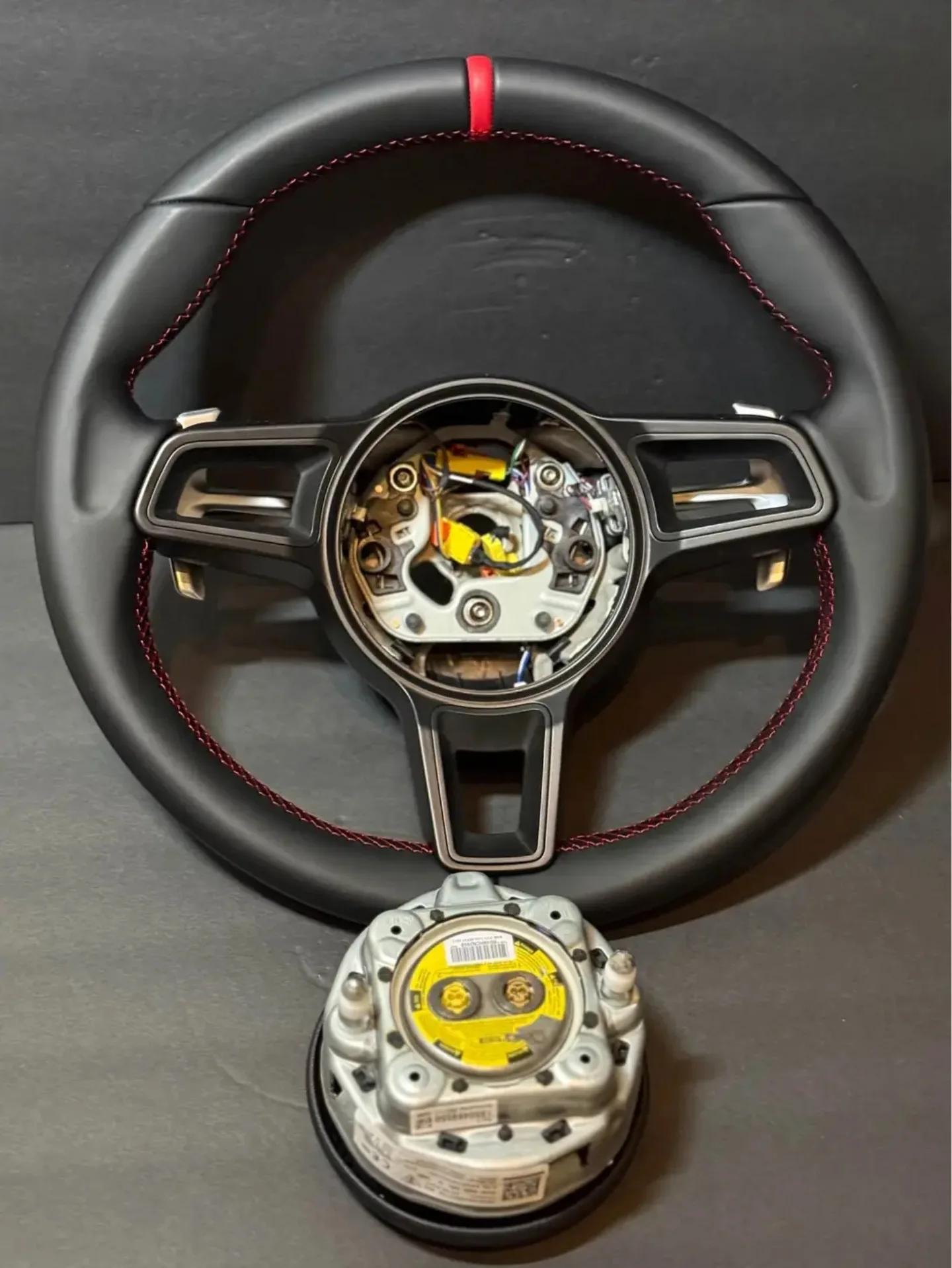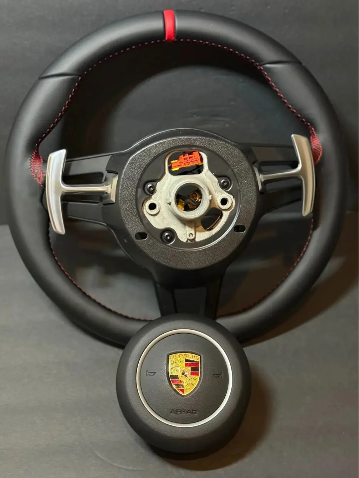 BLACK LEATHER Porsche Steering Wheel991.2 997 GT 911 Cayman Boxster Macan Cayenne with red stitching and red stripe. Shipping or delivery available! Worldwide shipping available